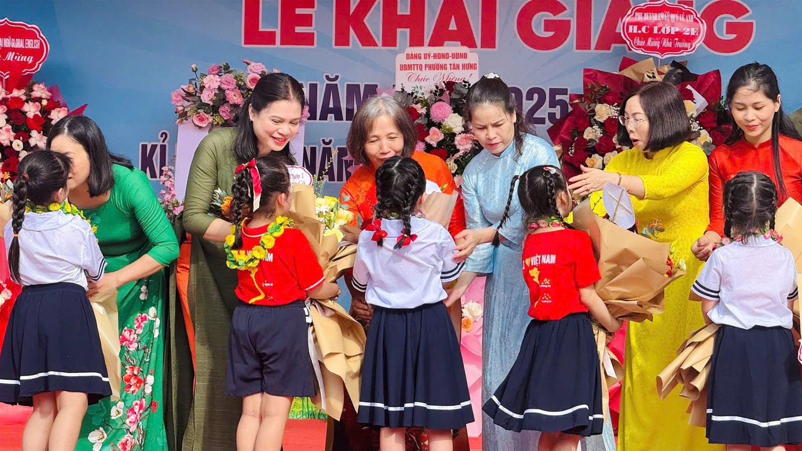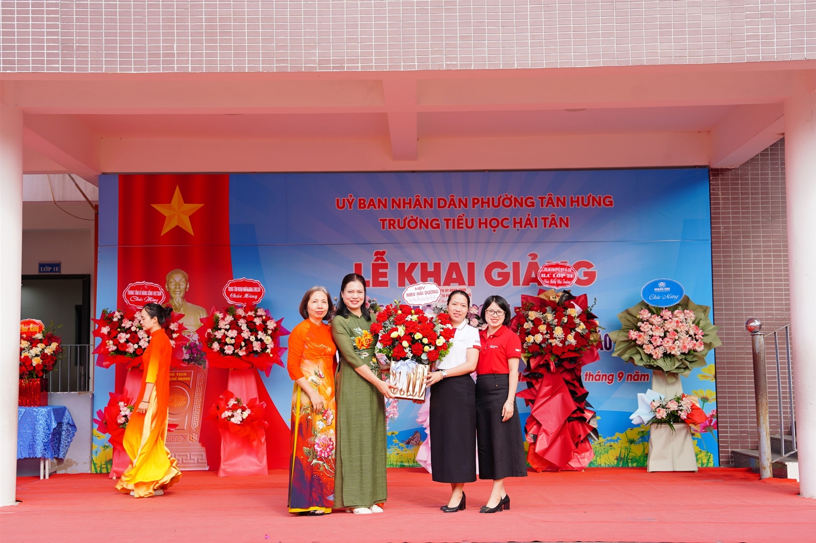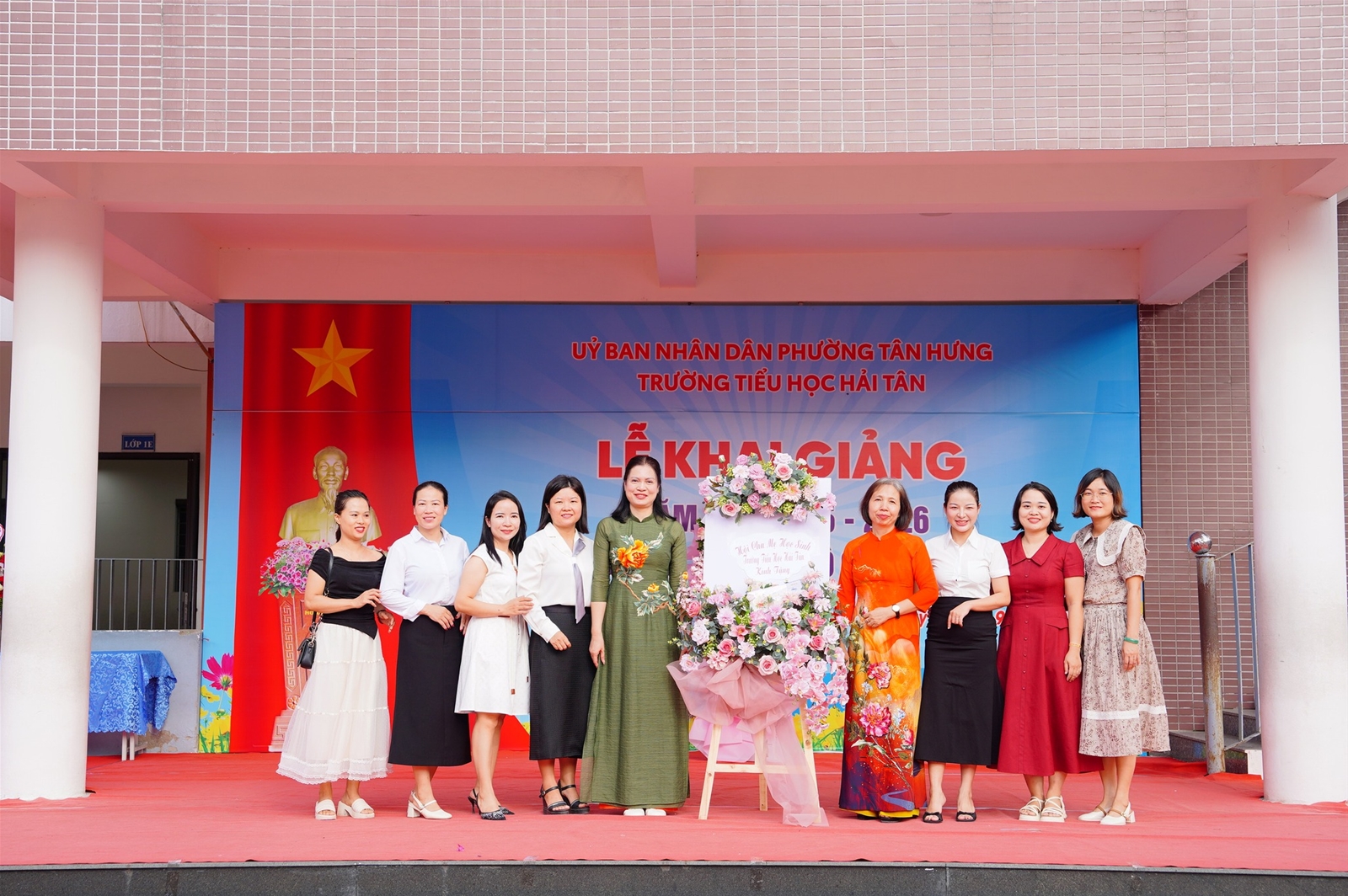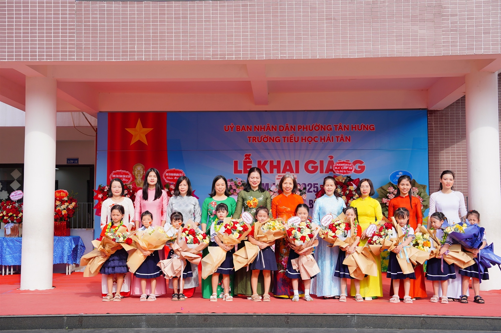 Trước giờ khai giảng trực tuyến, ngay từ sáng sớm sân trường Hải Tân đã ngập tràn sắc màu cờ hoa, tiếng trống rộn rã. Học sinh các khối 2, 3, 4, 5 trong đồng phục chỉnh tề xếp thành hàng dài, chào đón hơn 200 em lớp 1 – thế hệ học trò đầu tiên bước chân vào mái trường tiểu học. Bước chân rụt rè xen lẫn ánh mắt háo hức của các em nhỏ hoà trong tiếng reo hò, tràng pháo tay của anh chị đi trước tạo nên một khung cảnh vừa trang nghiêm, vừa ấm áp tình thân. Khoảnh khắc ấy trở thành dấu ấn khó quên, đánh dấu bước ngoặt chuyển giao từ bậc mầm non sang tiểu học.